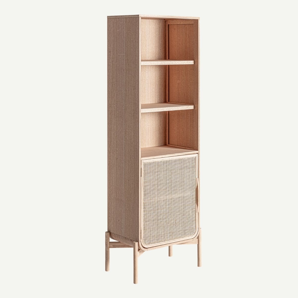 Fabriquée en bois de frêne, cette bibliothèque propose de larges étagères ouvertes idéales pour vos livres, objets déco ou souvenirs, complétées par un compartiment bas dissimulé derrière une porte tressée en rotin. Portée par de fins pieds en bois, elle diffuse une atmosphère douce et bohème, et devient une pièce pleine de caractère dans votre intérieur.