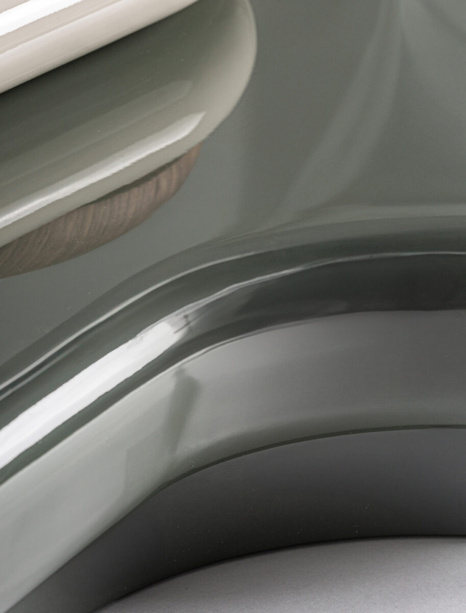 Buffet Art Déco au vert laqué éclatant, il joue avec la lumière comme un joyau contemporain. Ses courbes audacieuses s’opposent à la pureté de son plateau en céramique blanche. Derrière ses portes discrètes, il cache un espace généreux. Un meuble qui conjugue poésie des formes et raffinement des matières.