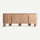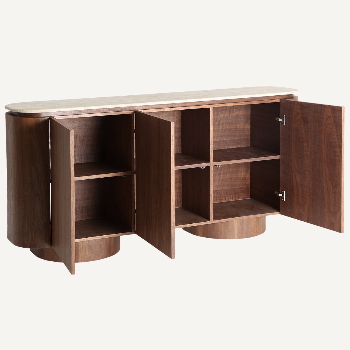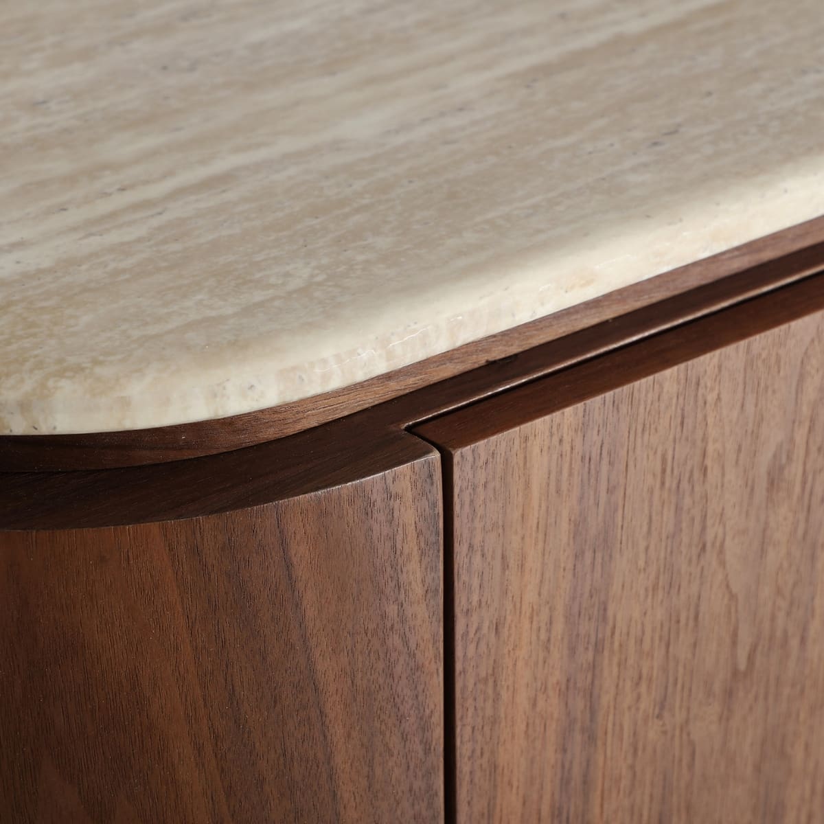 Ce buffet de 180 cm évoque la douceur des formes. Son dessus en travertin synthétique, élégant et lumineux, contraste avec la profondeur du placage de bois foncé et dissimule des compartiments spacieux derrière ses portes parfaitement intégrées.