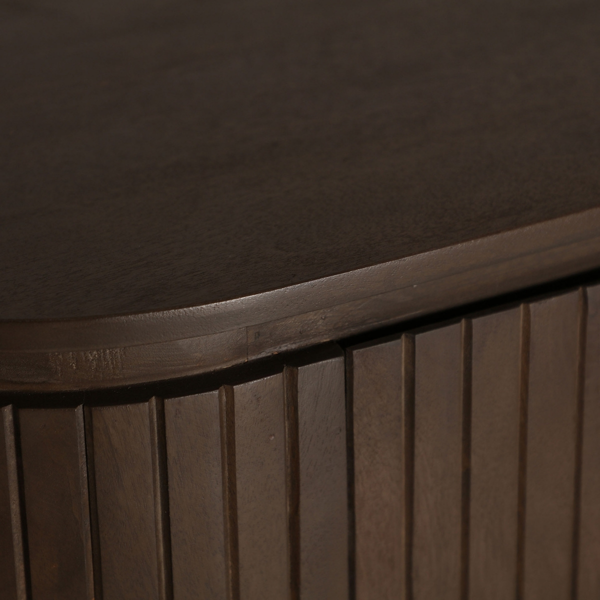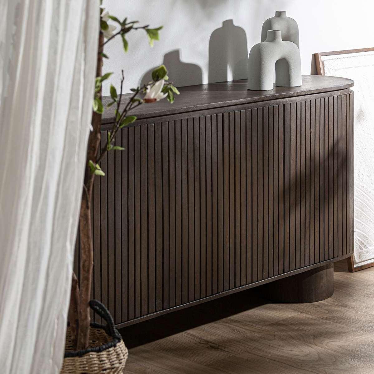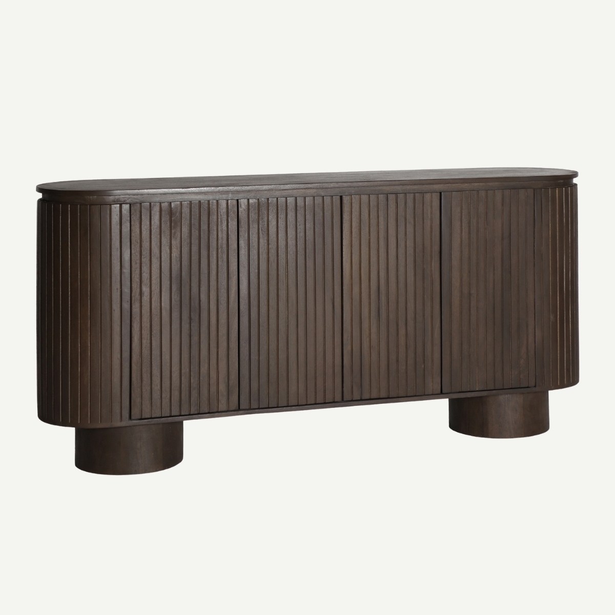 Ce buffet en bois de manguier massif de 180 cm capte la lumière comme une œuvre vivante. Ses portes finement rainurées dessinent un rythme délicat, tandis que ses contours arrondis adoucissent la robustesse du bois. Ses pieds cylindriques, ancrés comme des colonnes, soutiennent une structure pleine de caractère où se cachent deux grands espaces de rangement derrière quatre portes discrètes.