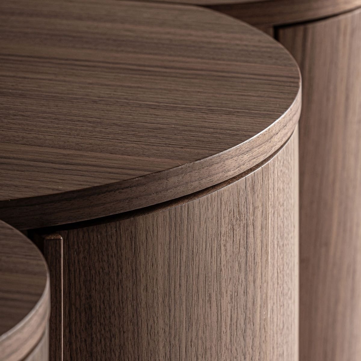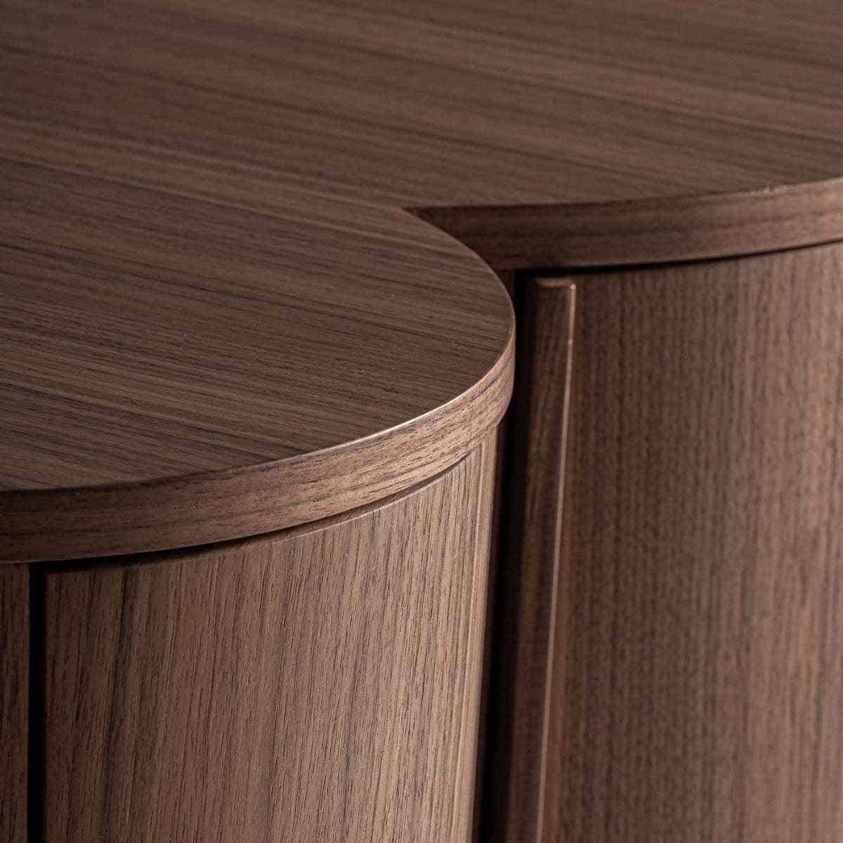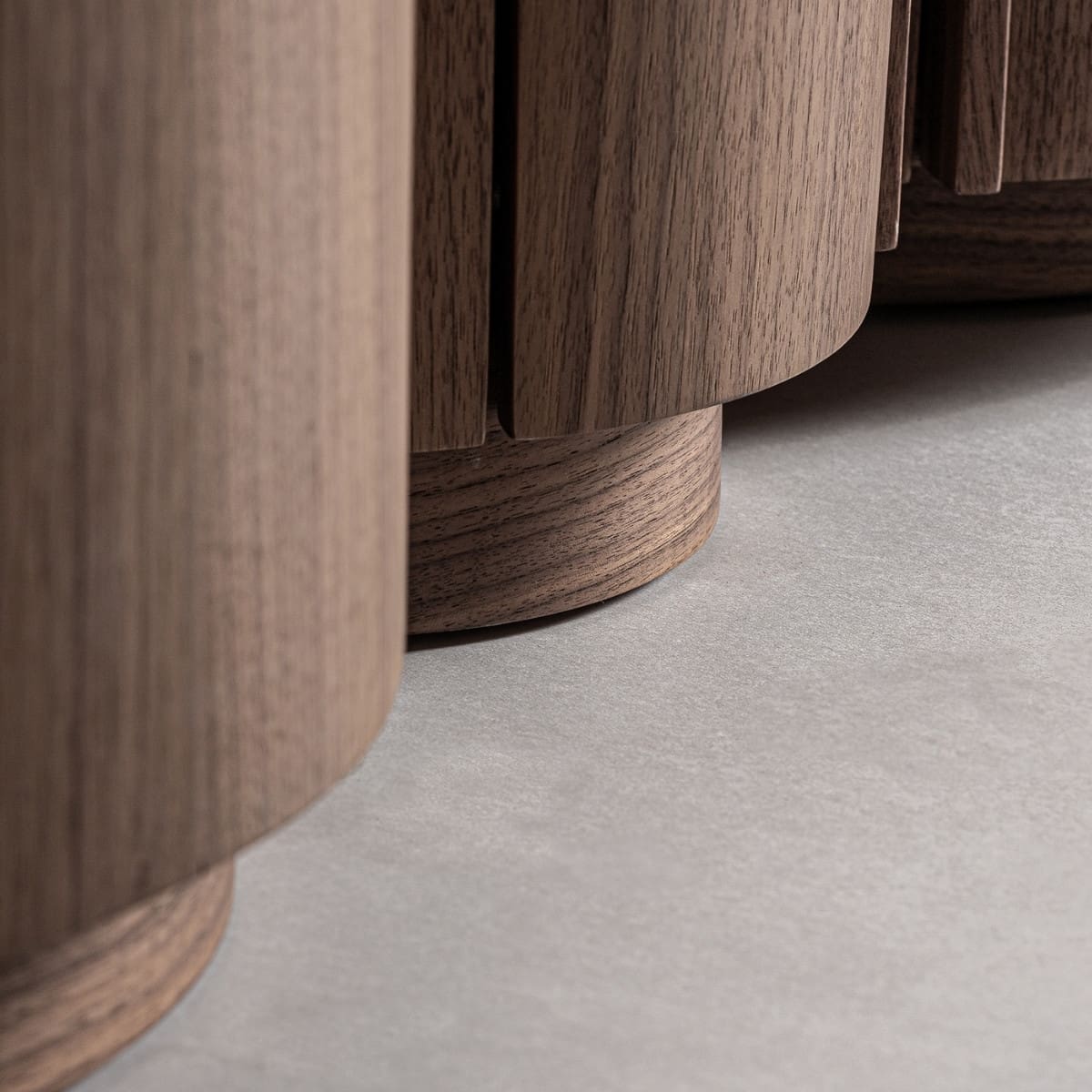 Tel une vague figée dans le bois, ce buffet en placage de noyer déploie ses courbes avec une grâce silencieuse. Les veines du noyer, profondes et mouvantes, dessinent un paysage où la lumière glisse et s’attarde. Derrière ses portes galbées, se cachent des espaces généreux, pensé pour accueillir sans jamais alourdir. Long de 242 cm, il impose sa présence avec la douceur d’un souffle, mêlant nature et design dans une même respiration.