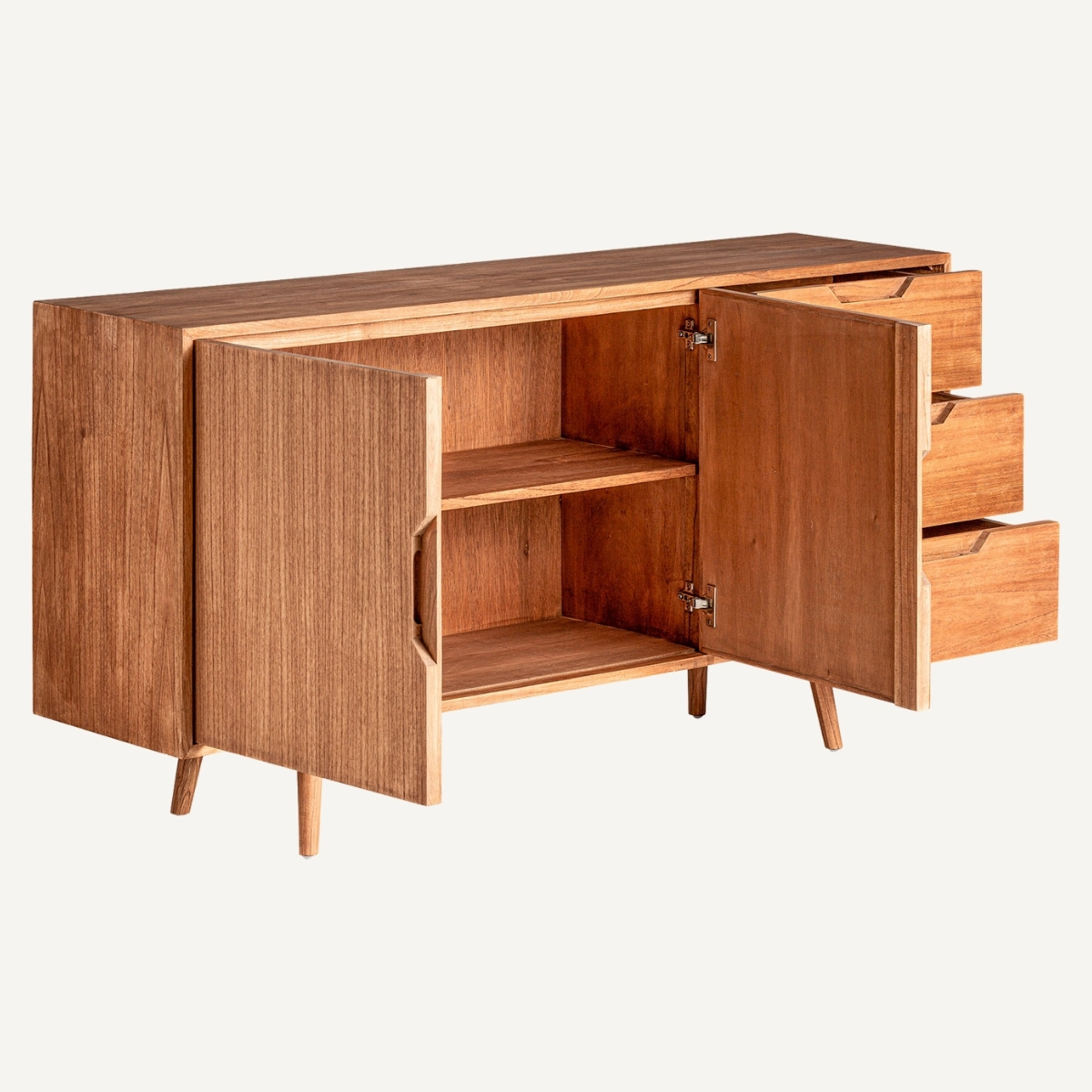 Long de 160 cm, ce buffet en bois massif de mindi s’impose avec la douceur tranquille des paysages nordiques. Ses lignes épurées semblent glisser sans effort, comme sculptées par le vent et la lumière, tandis que ses veines fines et régulières racontent la lente respiration de l’arbre dont il est issu. Les portes se rejoignent en une découpe subtile, presque graphique, tandis que les tiroirs s’ouvrent par des prises intégrées qui prolongent l’élégance fluide de l’ensemble. Aucun artifice, rien d’inutile : seulement la pureté d’un design qui laisse parler la matière. Élevé sur des pieds élancés, ce meuble paraît flotter, tel un fragment de maison scandinave où le calme règne, où chaque objet trouve naturellement sa place. Vous pourrez y déposer une lampe en céramique beige pour un style accordé.