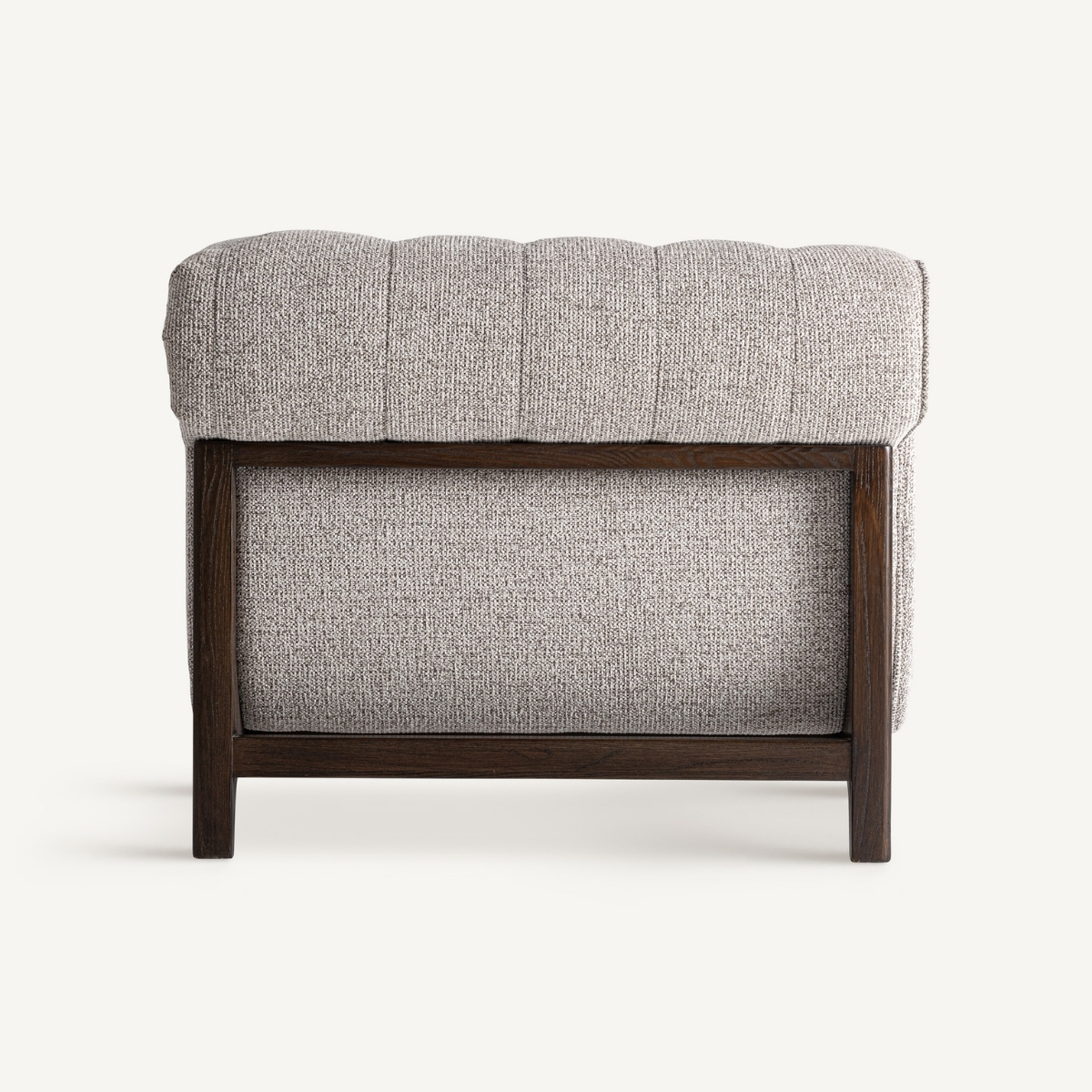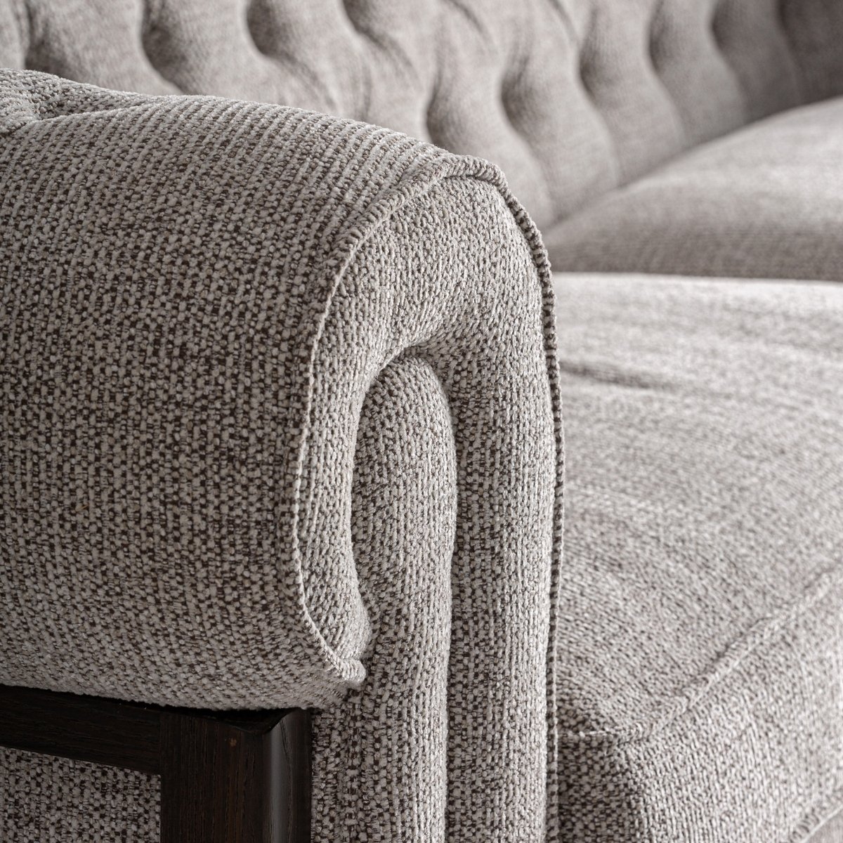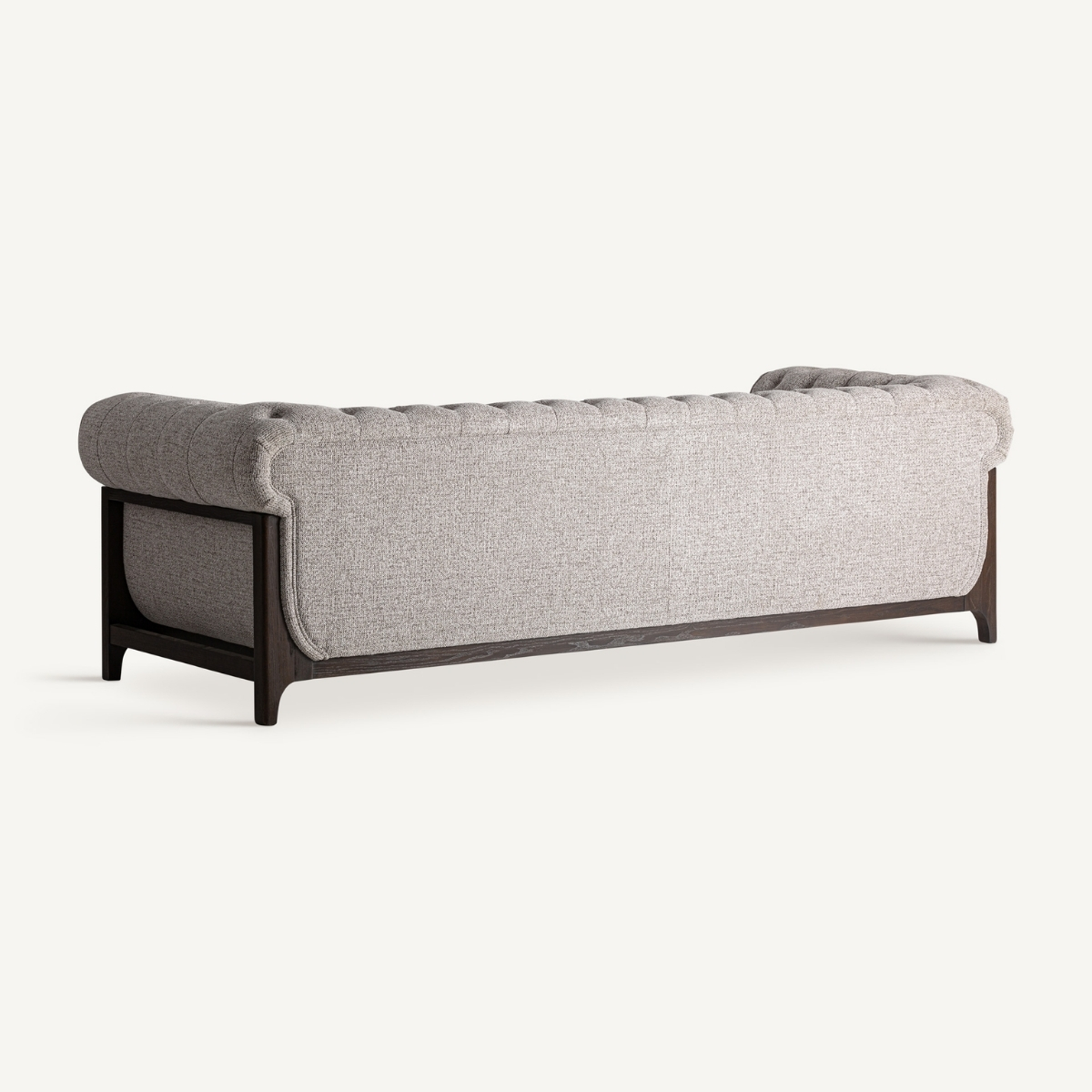Canapé Chesterfield bois de frêne et tissu gris capitonné ALAN