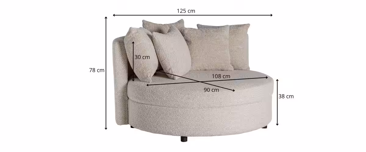 Ce canapé rond 2 places transforme n’importe quel coin de votre intérieur en véritable petit refuge. Avec sa forme circulaire ultra-accueillante et ses cinq coussins moelleux, il invite instantanément à s’y lover pour lire, discuter ou simplement se détendre. Sa texture bouclette beige, douce et chaleureuse, crée une ambiance cocon irrésistible, presque comme un nid douillet posé au milieu du salon. Son dossier enveloppant apporte une sensation de sécurité et de confort total. Un choix parfait pour donner du caractère à un espace lounge ou créer une parenthèse cosy dans une grande pièce de vie.