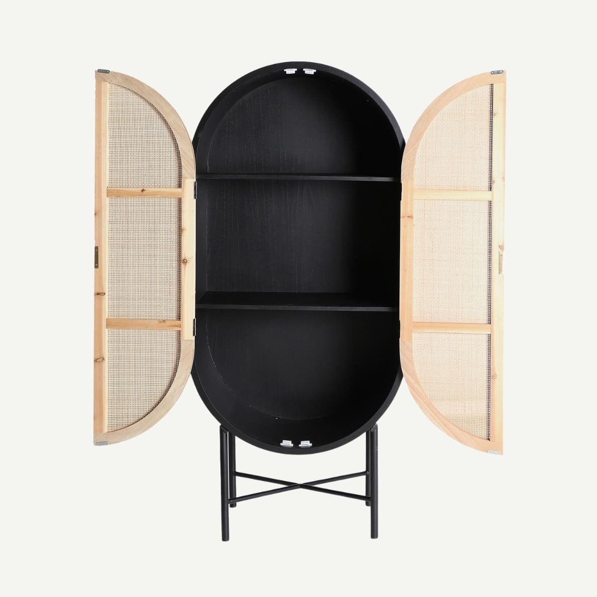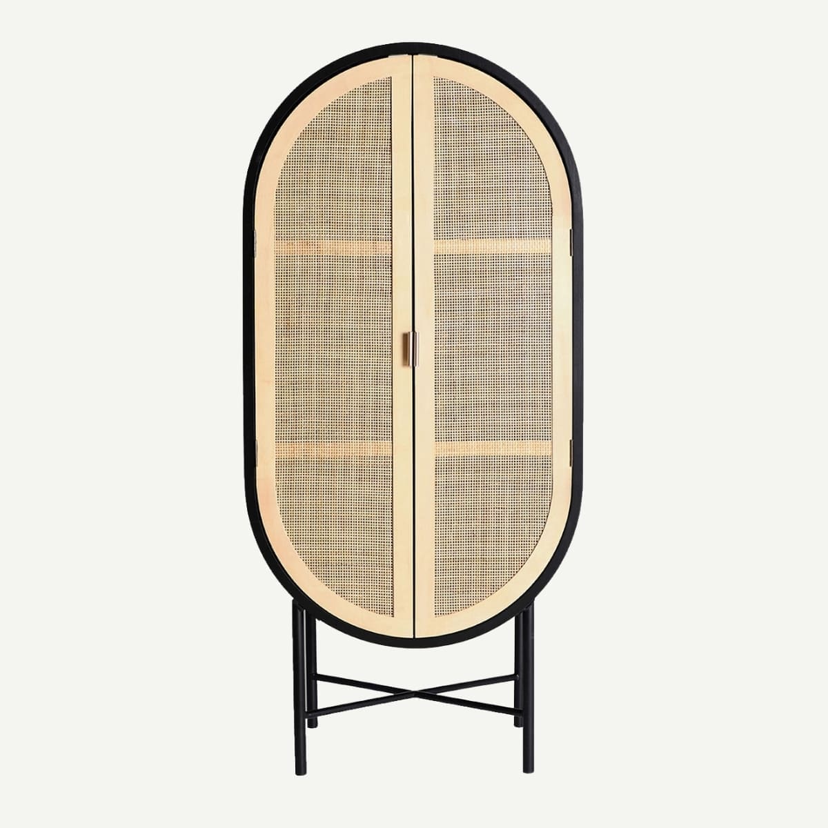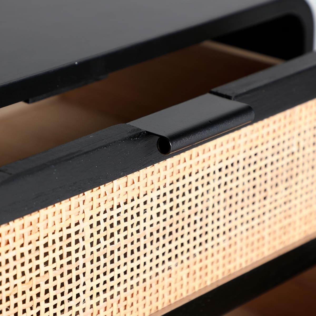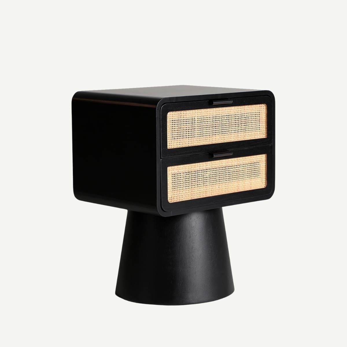 Ce chevet 2 tiroirs en pin noir et rotin naturel s’impose comme un petit totem domestique. Avec son socle conique rappelant une sculpture et ses façades en cannage tissé comme des éclats de lumière, il marie mystère et douceur. Un compagnon de nuit qui allie l’esprit japandi à une aura presque rituelle.