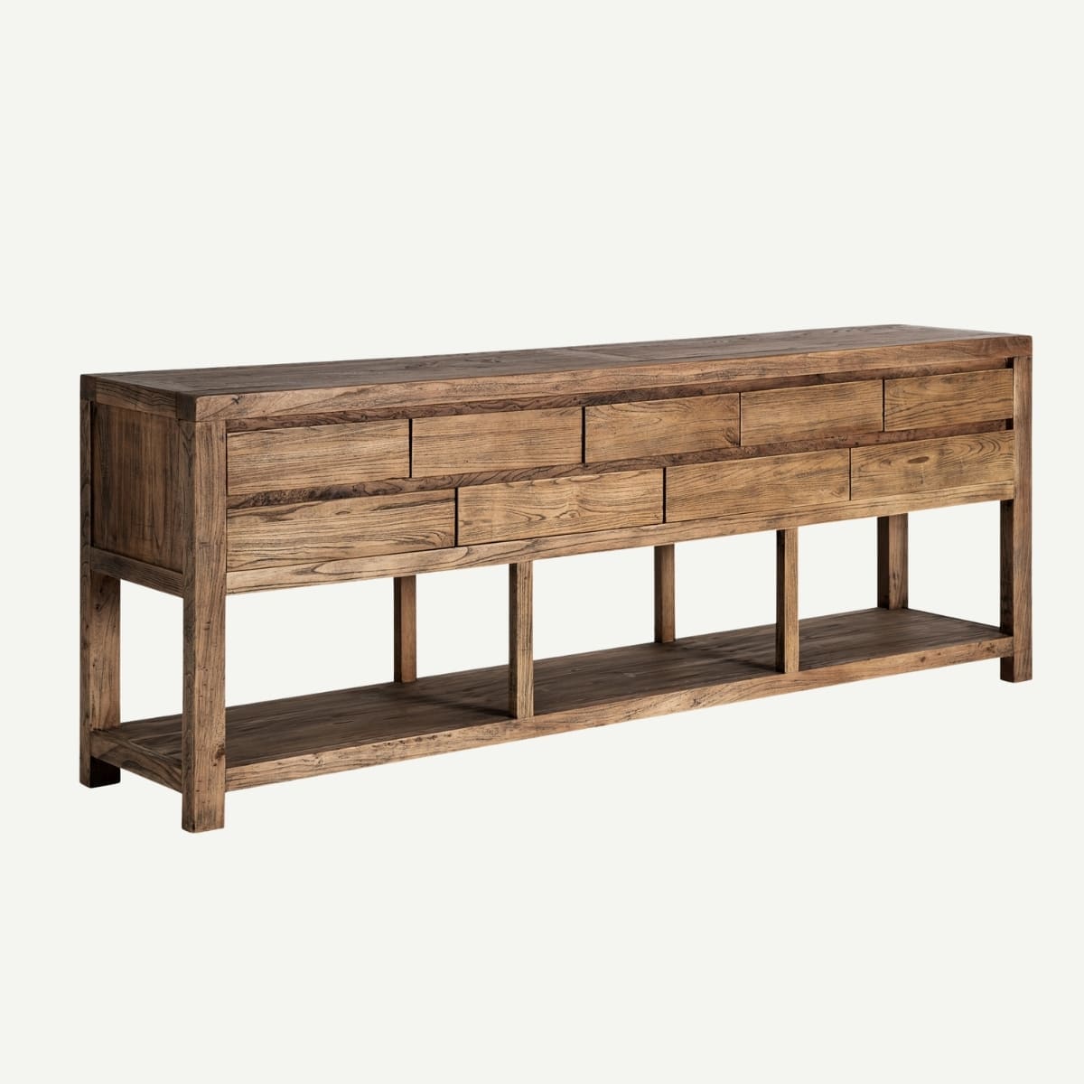 Avec son allure d’antan et son charme intemporel, cette console en bois d’orme massif de 220 cm s’impose comme une pièce d’exception. Ses 9 tiroirs rappellent le mobilier d’atelier d’autrefois, où chaque détail respire l’authenticité. Les veinures profondes, les nœuds et les marques du bois racontent une histoire, conférant à chaque meuble une âme unique. Pratique et majestueuse, cette console traverse les modes et habille vos intérieurs d’une élégance rustique et singulière.