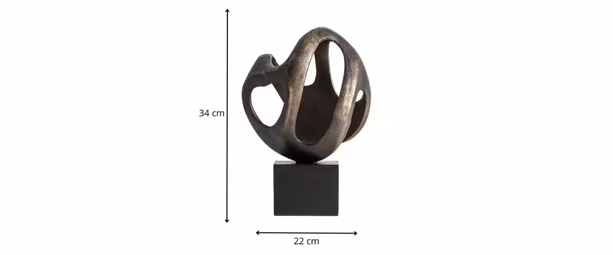 Cette sculpture contemporaine, aux courbes torsadées et presque liquides, semble figée dans un mouvement continu. Sa finition dorée antique accroche la lumière comme un métal patiné par le temps, donnant vie à chaque creux et ouverture. Posée sur son socle noir minimaliste, elle devient un point focal hypnotique, mêlant mystère et élégance.