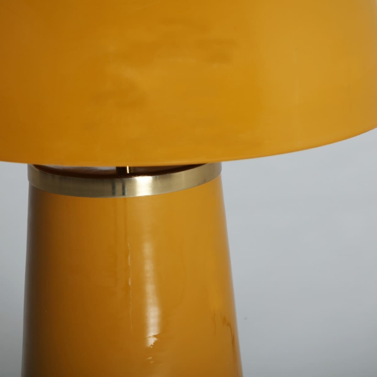 Avec son style iconique en forme de champignon et sa teinte moutarde/orange audacieuse, cette lampe de table rétro des années 70 est revisitée avec modernité. Son abat-jour arrondi diffuse une lumière douce et chaleureuse, idéale pour créer une ambiance conviviale et feutrée. La base conique, rehaussée d’un discret anneau doré, ajoute une note chic.