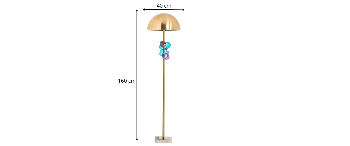 Ce lampadaire art déco transforme la lumière en véritable spectacle grâce à ses bulles de verre colorés qui dansent autour de sa tige dorée. Le dôme en métal doré diffuse une lueur chaleureuse, faisant vibrer les reflets turquoise et violets comme des gouttes en apesanteur. Son design sculptural attire le regard et devient instantanément la pièce maîtresse d’un intérieur moderne et raffiné. Une suspension qui mêle audace artistique et charme rétro avec grâce. Pour un ensemble encore plus spectaculaire, associez ce lampadaire avec le lustre de la même collection afin de créer une harmonie lumineuse irrésistible.