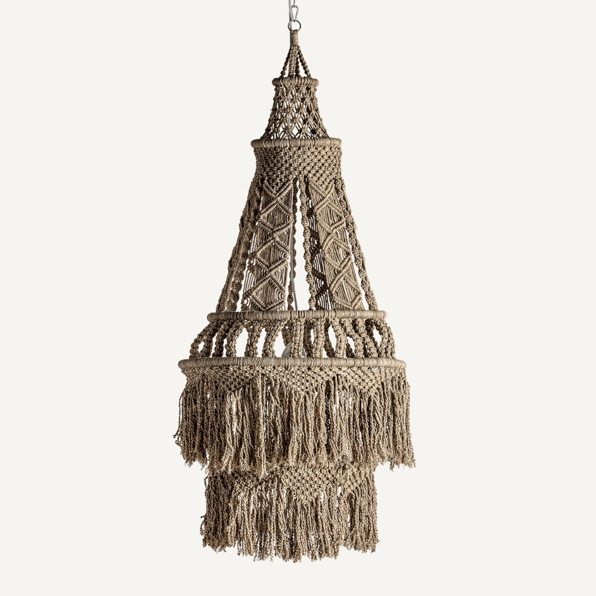 Ce lustre en coton marron apporte une vraie signature bohème à votre intérieur. Entièrement tressé, il se compose de plusieurs étages superposés qui créent un volume généreux et sculptural. Les longues franges et les nœuds décoratifs accentuent son charme et diffusent une ambiance douce et chaleureuse une fois la lumière allumée. Avec ses lignes souples et son tissage délicat, il devient la pièce maîtresse idéale pour un salon, une chambre ou un espace au style naturel et apaisant.
