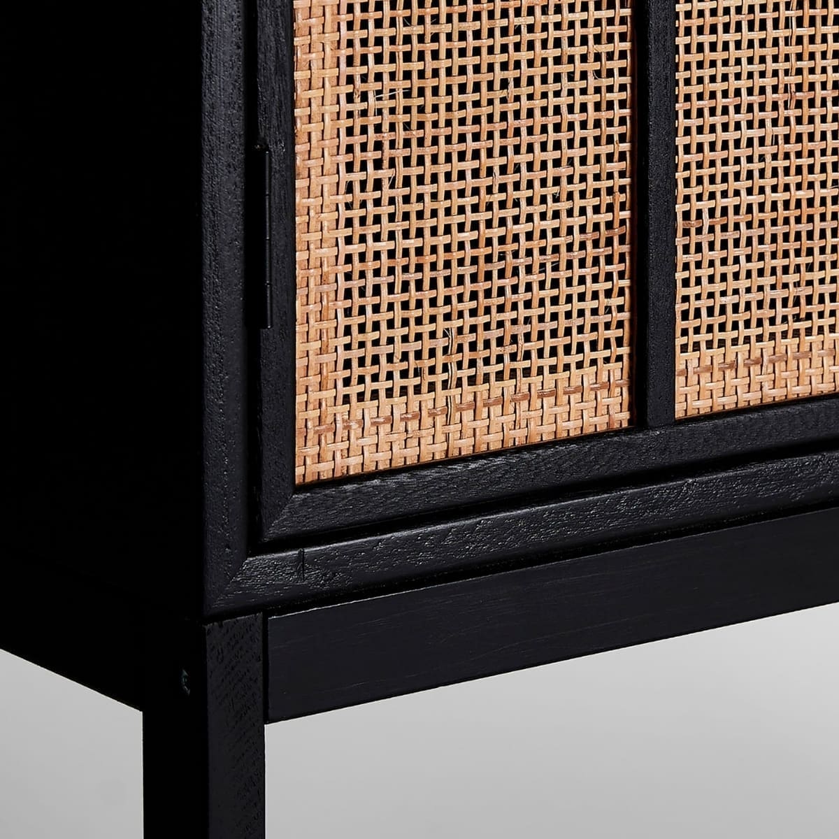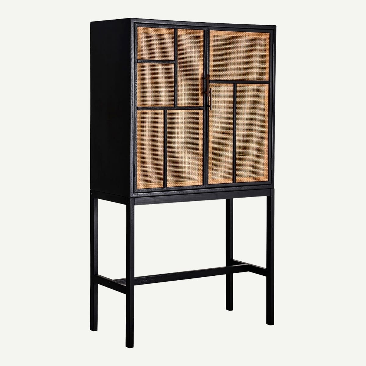 Ce meuble de rangement en pin noir et rotin naturel semble suspendu entre tradition et modernité. Ses portes aux motifs graphiques tressés jouent avec la lumière, comme un paravent délicat. Haut et élancé, il mêle l’épure japonaise à la douceur scandinave, transformant le rangement en véritable rituel esthétique.