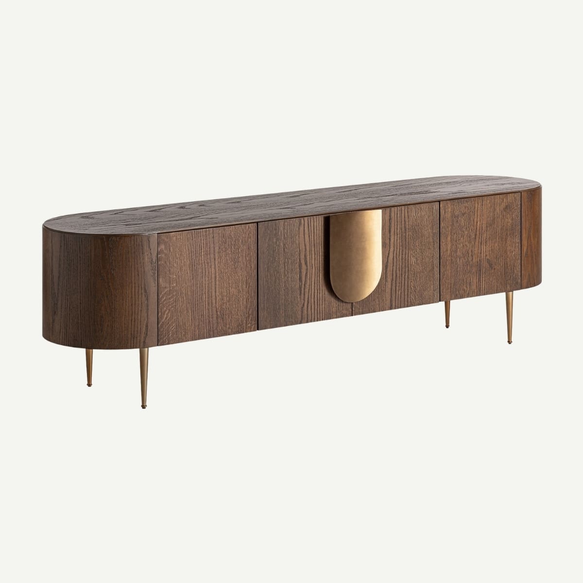 Revêtu d’un placage de chêne foncé, ce meuble TV de 200 cm séduit par sa prestance discrète et son allure équilibrée. Ses pieds dorés fuselés lui confèrent une légèreté raffinée, tandis que le panneau central en métal doré mat capte la lumière avec élégance. Derrière ses portes et tiroir, un agencement sobre et fonctionnel offre l’espace idéal pour accueillir appareils et accessoires, dans un esprit à la fois moderne et intemporel.
