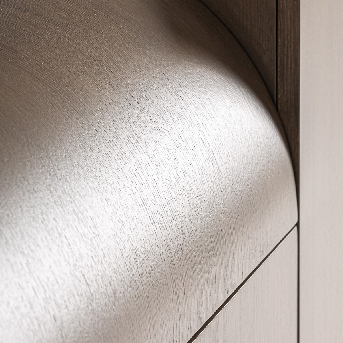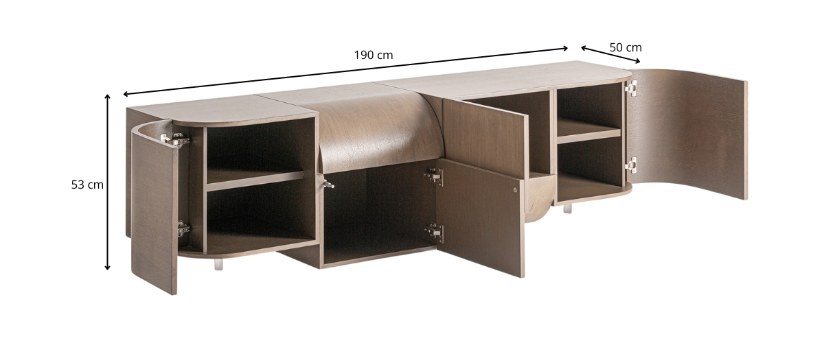 Ce meuble TV joue sur une succession de volumes qui se répondent le long de sa ligne, mêlant surfaces droites et arrondies. Selon le point de vue, les formes paraissent évoluer et donner du relief à l’ensemble. Le placage de bois révèle ses variations de teinte sous la lumière, renforçant cette sensation de mouvement. Pratique au quotidien, il propose des rangements généreux tout en apportant une vraie signature décorative au salon.