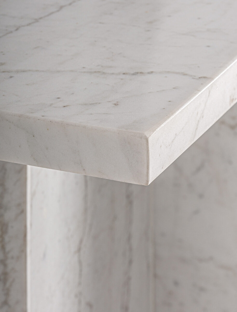 Sous la caresse du marbre blanc, la profondeur du manguier sombre révèle toute sa splendeur. Ce meuble TV de 200 cm semble né d’un dialogue entre ombre et lumière, entre la rigueur de la pierre et la chaleur du bois. Derrière ses portes, l’espace s’ouvre avec justesse. Alliance du minéral et du végétal, ce meuble évoque la sérénité d’une pièce de musique lente, où chaque détail compte, où chaque matériau raconte une histoire de matière, de temps et d’équilibre.