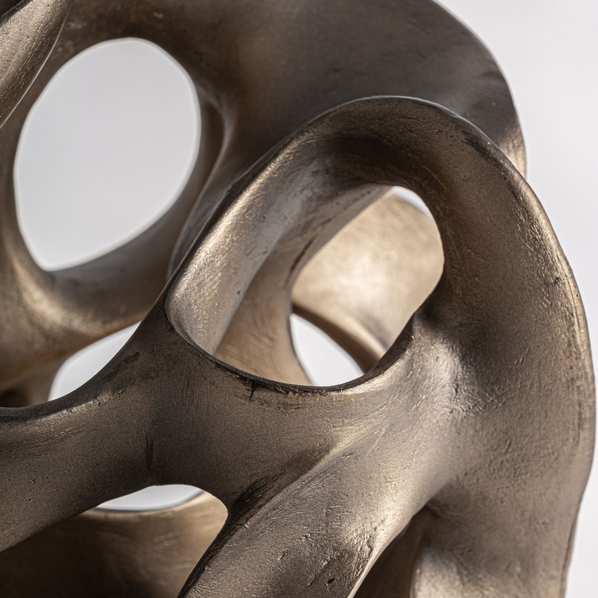 Cette sculpture contemporaine, aux courbes torsadées et presque liquides, semble figée dans un mouvement continu. Sa finition dorée antique accroche la lumière comme un métal patiné par le temps, donnant vie à chaque creux et ouverture. Posée sur son socle noir minimaliste, elle devient un point focal hypnotique, mêlant mystère et élégance.