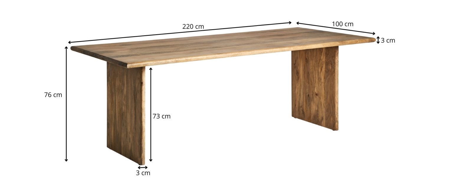 Une table à manger rectangulaire en bois de manguier massif, portée par deux pieds. Le plateau épais révèle de belles nuances dorées et des veinures naturelles, apportant chaleur et caractère à la pièce. Une table pensée pour les repas qui rassemblent et les moments qui comptent. Associez-la à des chaises en tissu ou en cuir pour créer un ensemble harmonieux et accueillant.