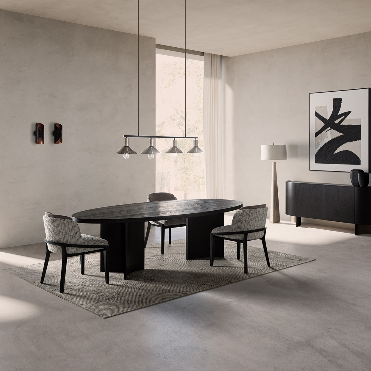 Majestueuse, cette table de 270 cm semble flotter entre ombre et lumiĂšre. Son placage de chĂȘne foncĂ©, Ă la texture vibrante, capte chaque reflet comme un souvenir gravĂ© dans le bois. Les pieds incurvĂ©s dessinent une silhouette presque architecturale, Ă la fois puissante et apaisĂ©e, telle une sculpture silencieuse au cĆur de la piĂšce. Autour dâelle, les conversations murmurent, les verres tintent, et le temps suspend sa course, cette table nâest pas quâun meuble, câest une scĂšne oĂč se joue la beautĂ© du quotidien.