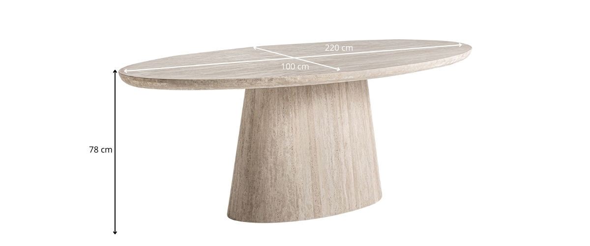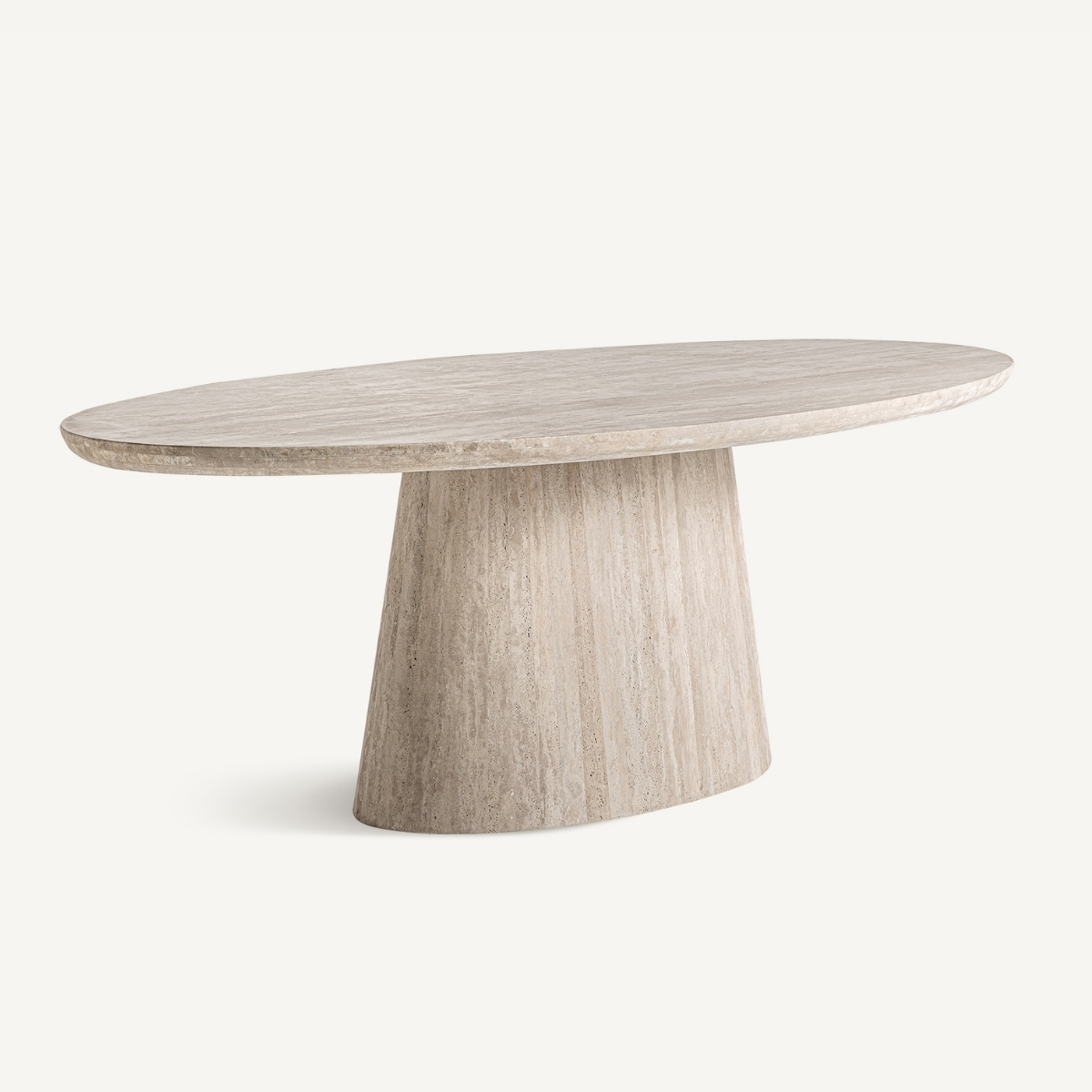 Cette table de repas ovale en travertin beige séduit par son piétement central aux volumes affirmés et son plateau aux bords adoucis, qui mettent en valeur les variations naturelles de la pierre. Chaque détail révèle l’authenticité du travertin et fait de cette table une pièce singulière, pensée pour accompagner les repas et les moments de convivialité au quotidien. Elle s’intègre facilement dans une salle à manger contemporaine ou minérale et s’associe parfaitement avec des chaises aux lignes sobres ainsi qu’avec la console de la même gamme ; explorez également les autres créations en travertin pour composer un intérieur harmonieux.