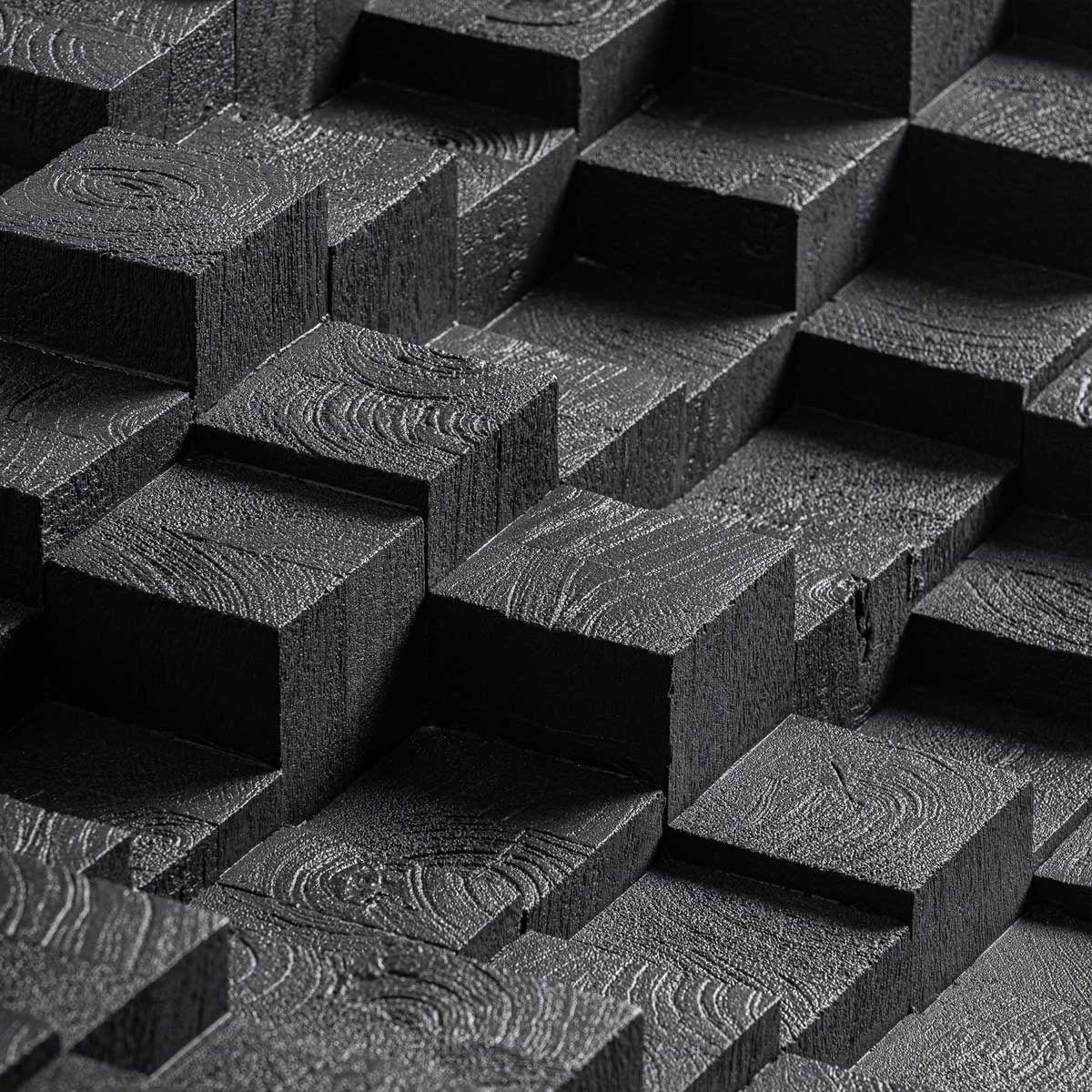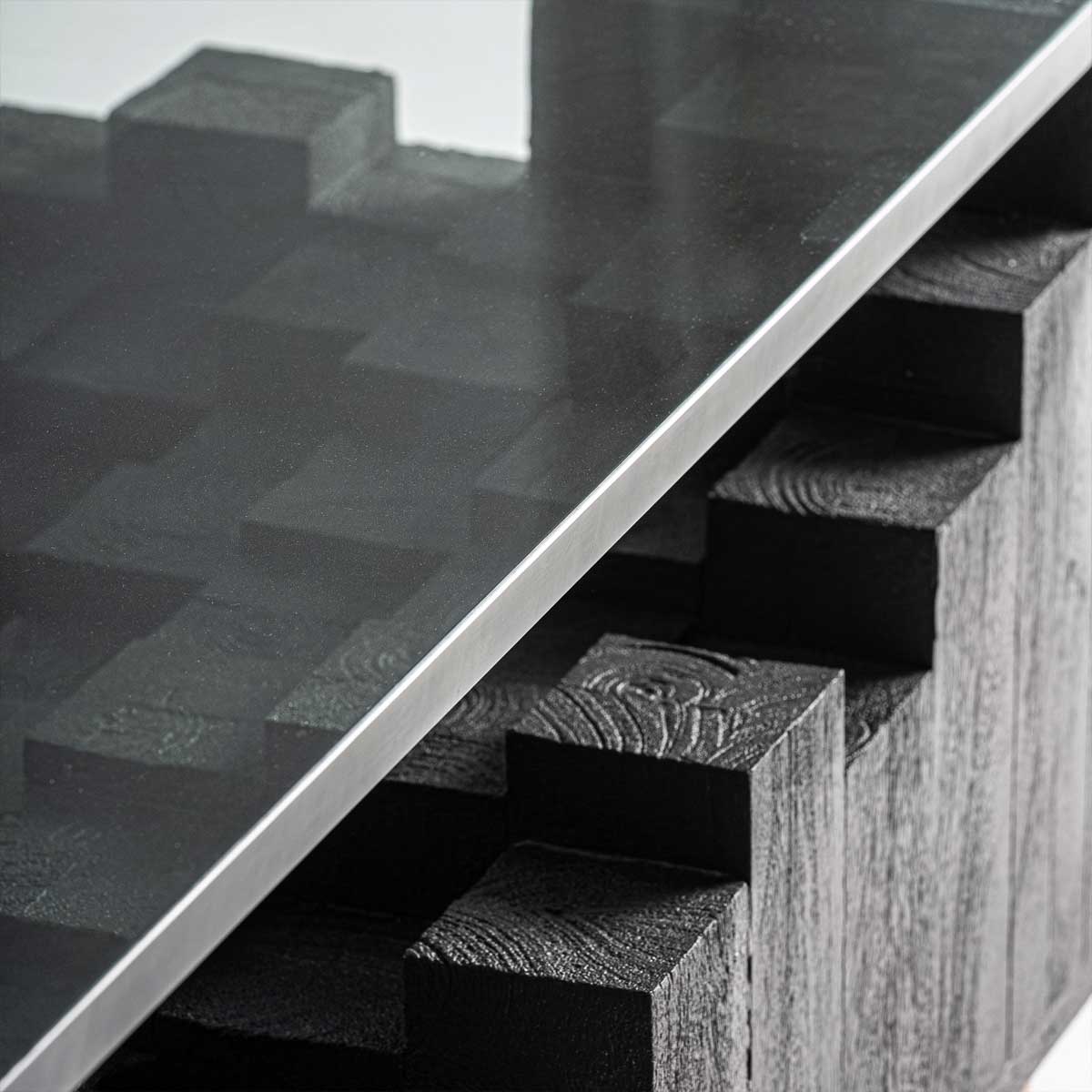 Ce n’est pas une table basse. C’est un bloc de paysage. Un fragment de relief capturé, posé au centre de la pièce. Taillée dans un manguier noir profond, sa surface n’est pas lisse : elle respire. Les formes géométriques, creusées comme un réseau de plateaux superposés, rappellent une topographie, un territoire brut, une coupe de terrain où la matière raconte sa propre histoire. On y voit les strates, les volumes, les ombres. On y sent la main, le feu, la terre. Sur cette base sculpturale repose un plateau de verre épais de 2 cm, clair, silencieux. Il ne cache rien : il révèle. Il laisse la lumière glisser, entrer, souligner les creux, amplifier les reliefs. Carrée de 98 cm, elle n’impose pas, elle existe. Autour, on s’assoit, on regarde, on laisse les choses prendre leur place. Une table, oui, mais surtout : un ancrage, un centre de gravité, un morceau de sculpture à vivre. À ses côtés, un canapé aux courbes calmes, chair de laine et lumière. La table ancre, le canapé relie. Ensemble, ils composent le paysage.