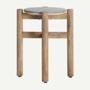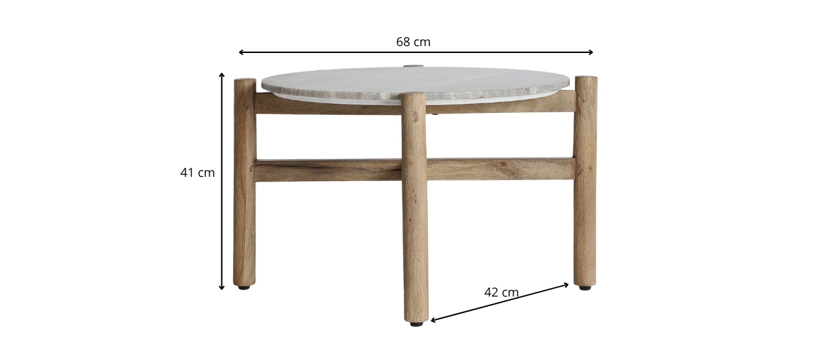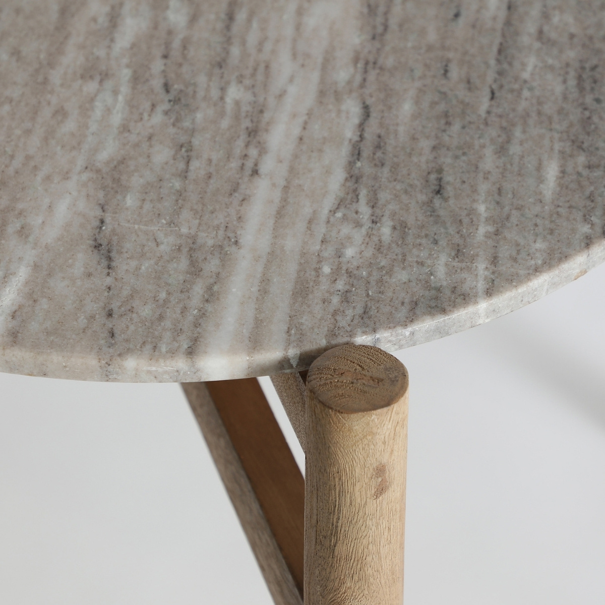 Comme un galet poli par le temps, le plateau en marbre repose avec douceur sur son socle de manguier, chaleureux et vivant. La table semble née d’un dialogue entre pierre et bois, entre minéral et matière organique. Sa rondeur invite à la convivialité, à la pause lente, au geste simple du matin. Elle habite l’espace sans l’imposer, comme un souffle discret qui apaise et rassemble. On y dépose une fleur séchée, un livre ouvert, un moment suspendu. On l’apprécie autant en solo qu’en duo avec une table d’appoint pour jouer l’effet de superposition.