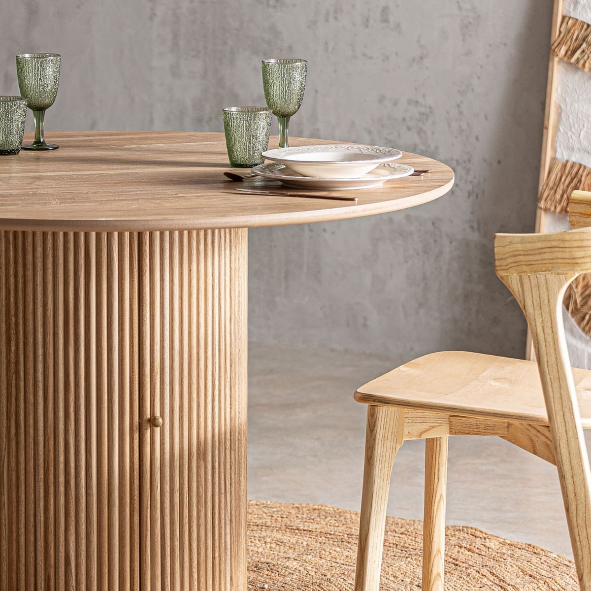 Cette table de repas ronde du style Japandi marie l’esprit scandinave à la délicatesse japonaise. Son large plateau en bois clair invite à partager des moments conviviaux, tandis que son pied cylindrique strié, cache un ingénieux espace de rangement discret.