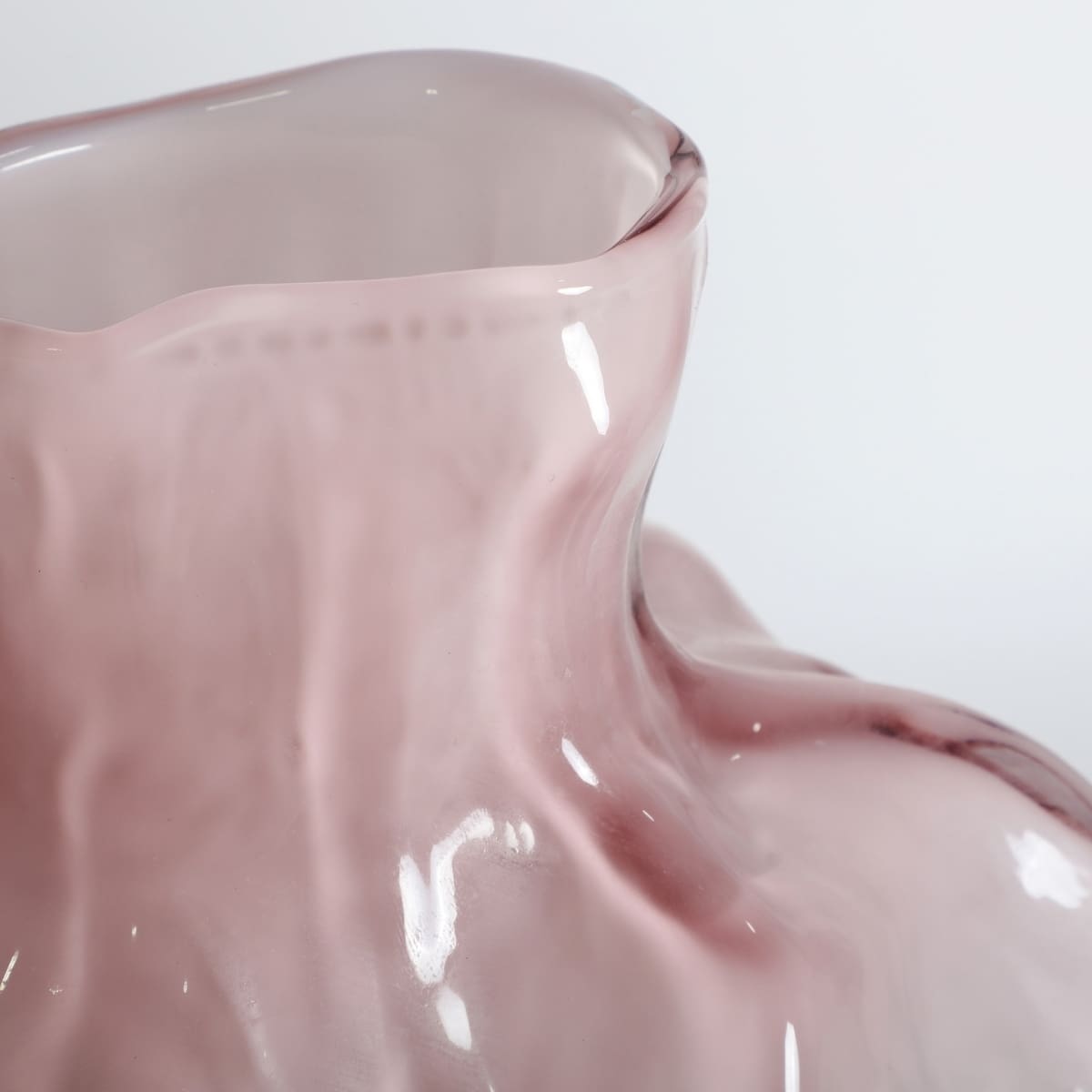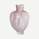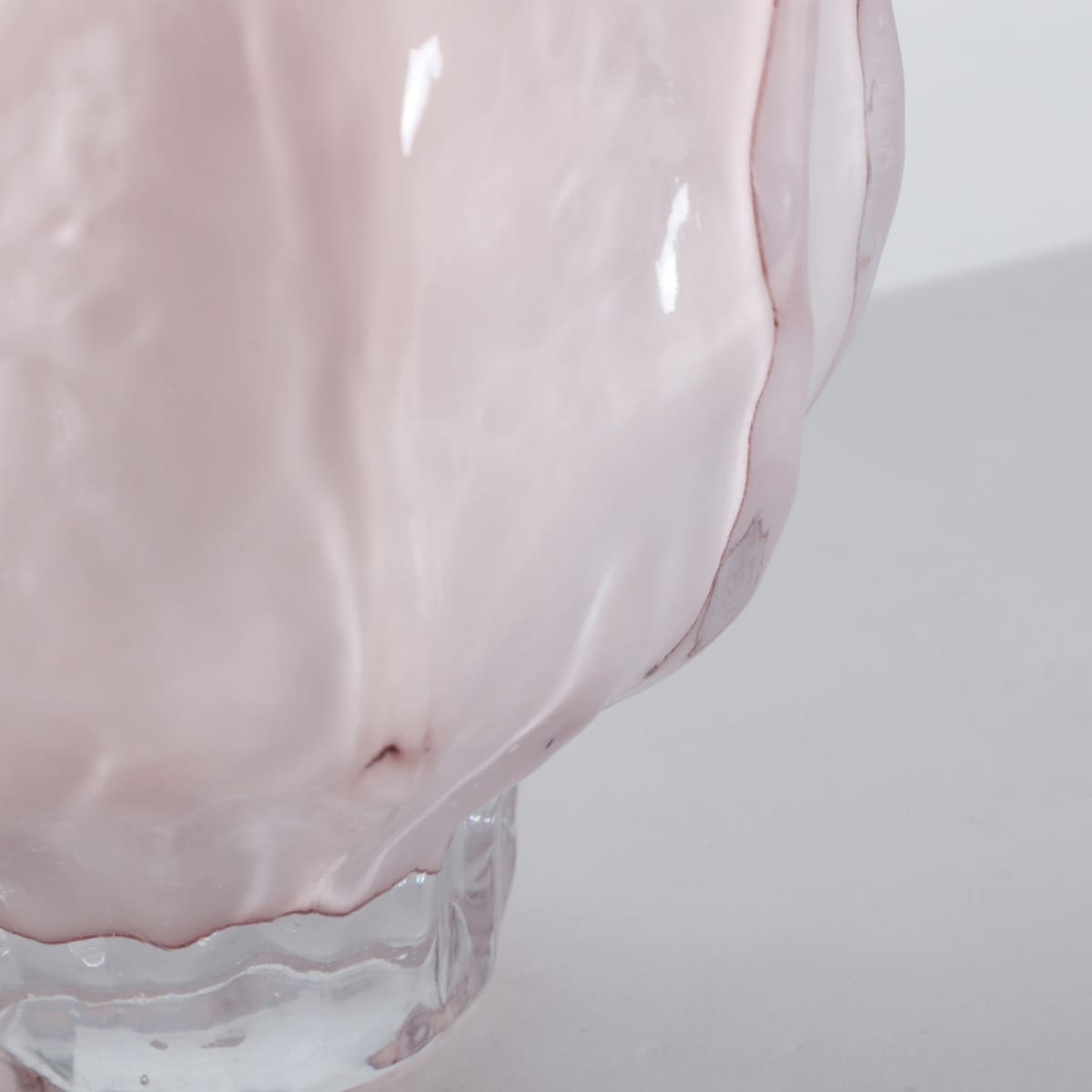 Ce vase en verre rose pâle semble né d’un souffle figé dans le temps. Ses plis et ondulations évoquent la fluidité du verre encore chaud, comme si la matière avait gardé la mémoire du geste du souffleur.