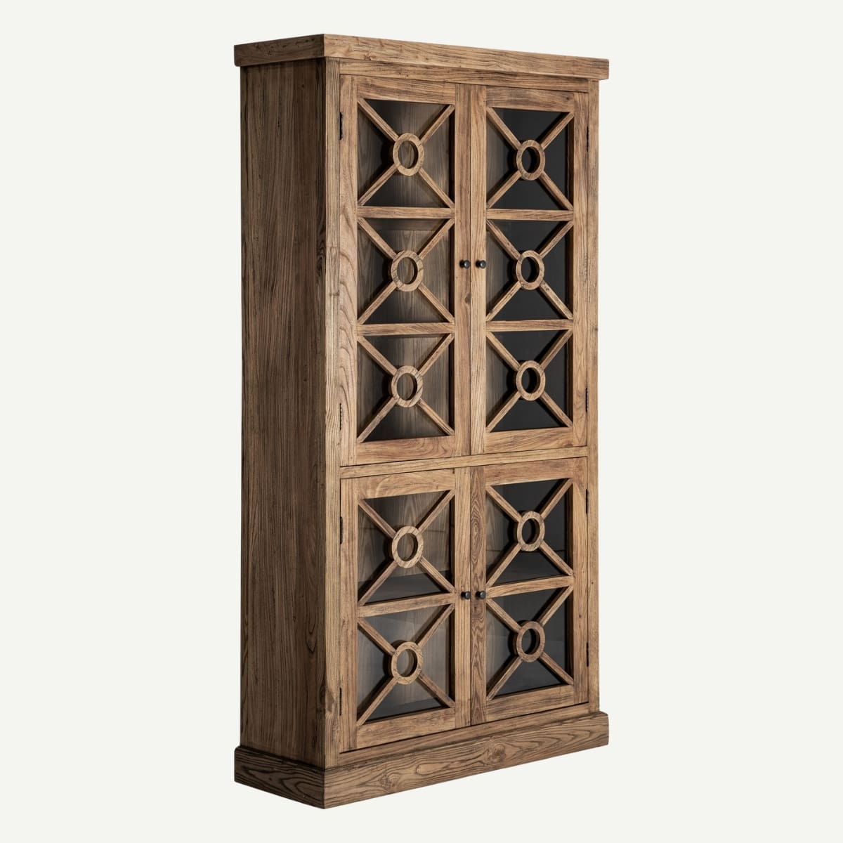 Élégante et singulière, cette vitrine en bois d’orme massif dévoile derrière ses 4 portes vitrées un espace pensé pour vos objets, vaisselle ou livres précieux. Les croisillons aux motifs géométriques évoquent l’esprit des anciennes officines, où chaque détail respirait la solidité et l’artisanat. Les veinures et nœuds du bois apportent chaleur et authenticité, faisant de cette pièce un meuble unique.